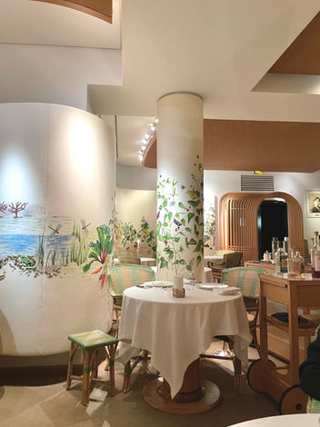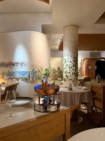 Chez L’Arpège, le lieu reflète parfaitement la cuisine du chef : épuré, lumineux, profondément habité. La salle, à la fois sobre et raffinée, marie les tons clairs du bois de poirier à l’éclat discret du cristal Lalique, dans une ambiance à la fois contemporaine et feutrée. Une fresque bucolique, peinte à même les murs, prolonge l’inspiration végétale jusque dans l’assiette : on y devine le lien étroit entre la terre, le produit et la main qui le travaille.