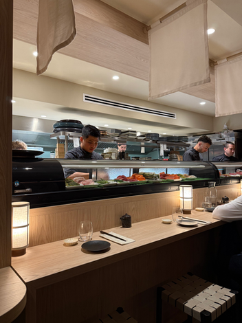 L’espace a été entièrement repensé par un cabinet d’architecture d’intérieur, avec une circulation fluide et des zones bien distinctes. Le comptoir permet d’observer la précision des gestes en cuisine et la découpe minutieuse des poissons pour les nigiri. La salle se prête parfaitement aux moments partagés entre amis ou en famille, tandis que le bar offre un point de vue privilégié sur la préparation des cocktails.